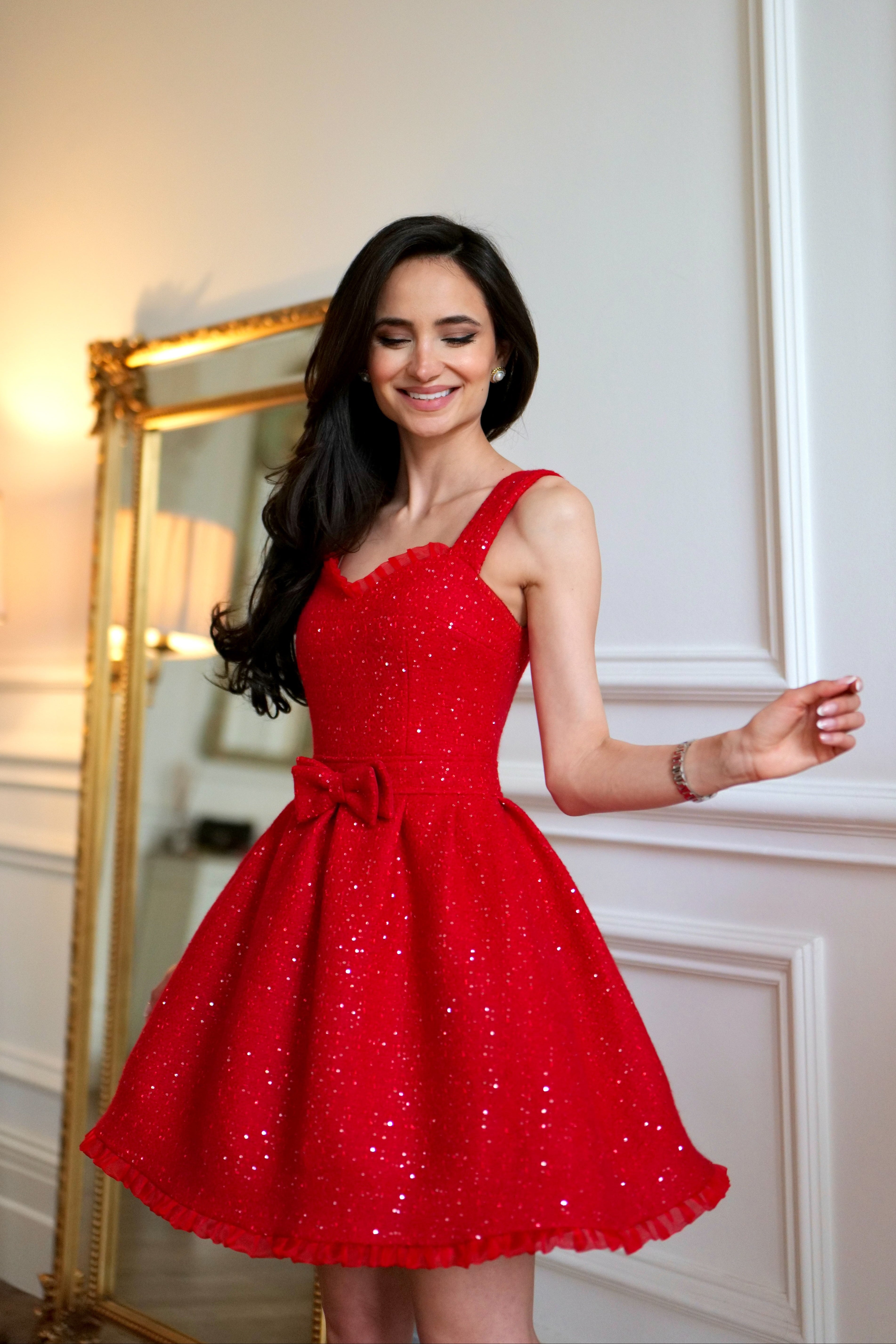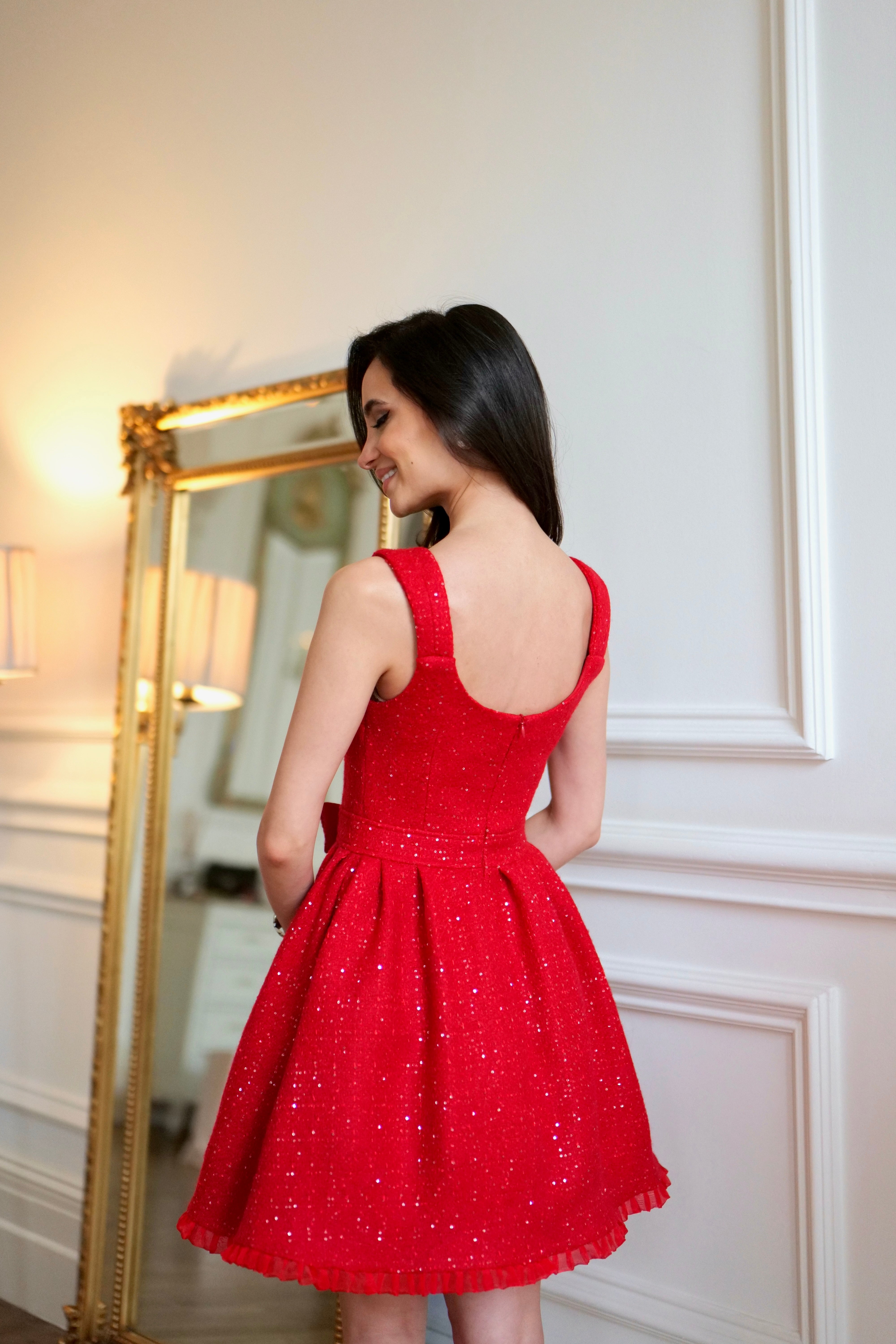 Grace and sophistication blend seamlessly in our 'Gracie’. Crafted from a breathtaking woollen tweed fabric, embellished with small paetes, which create a mesmerising sparkle. The delicate frill trim beautifully frames the sweetheart neckline and playful hemline. Expert tailoring ensures the waistline is accentuated, whilst the full-pleat skirt adds a touch of dreaminess. A delightful, detachable bow under the bust line adds a touch of feminine charm and completes this graceful creation.
