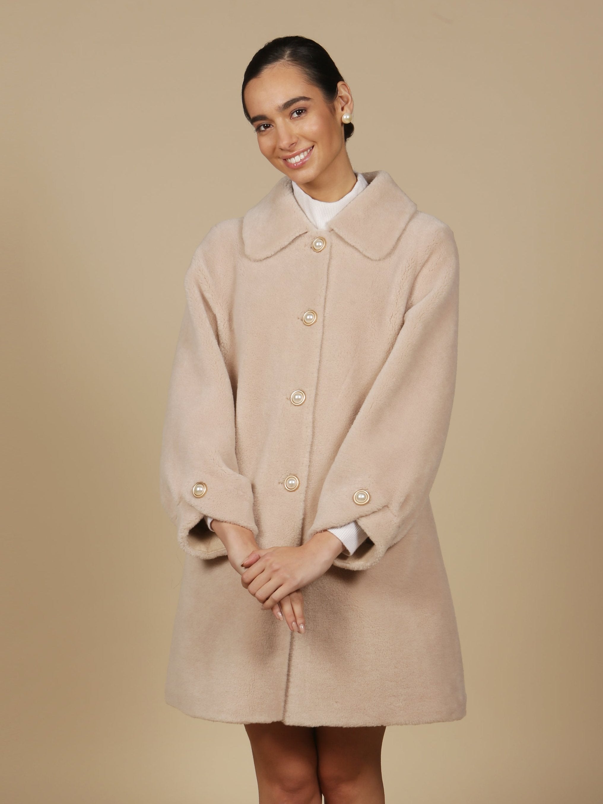 Nothing is quite as sweet as ‘Amore’. A classic silhouette, beautifully finished by a charming ‘Peter Pan’ collar and an ever so elegant cuff design featuring our signature gold and pearl buttons. This piece is handcrafted by artisans, from 100% ethically sourced wool, meaning it will keep you looking not only exceptionally sophisticated, but also incredibly warm.