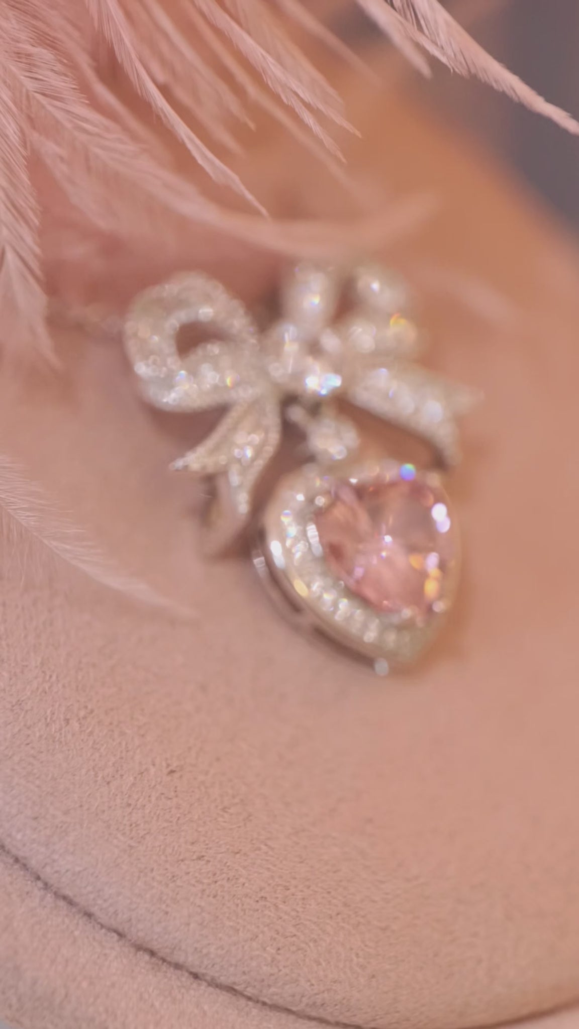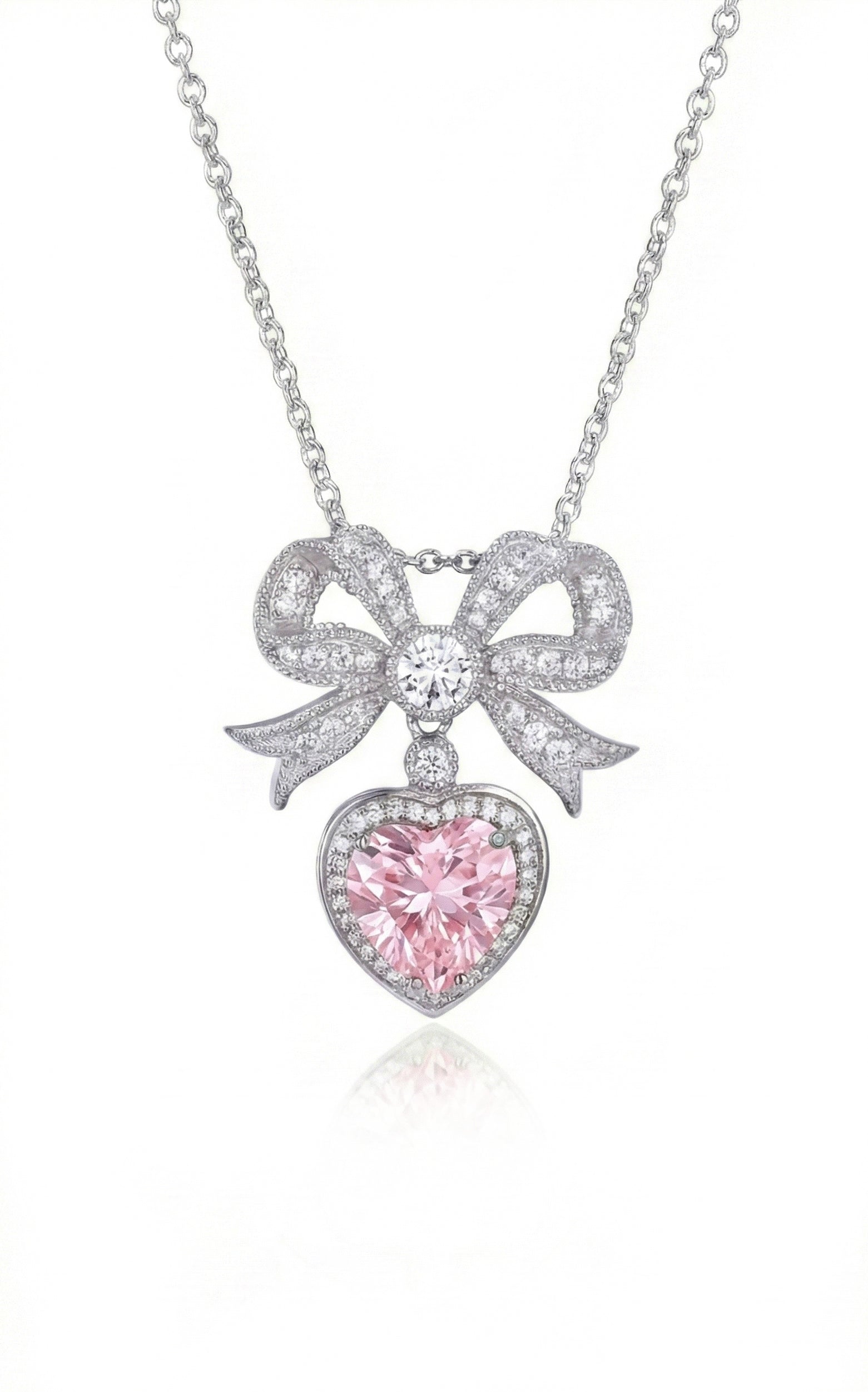 The pendant to match our 'Princess' earrings. Crafted from silver and plated in rhodium, this feminine and romantic pendant is the pièce de résistance of any jewellery collection. A sparkling pink, heart-shaped zirconia crystal, framed exquisitely by small shimmering crystals, hangs from beneath a stunning, ornate bow. Watch the fire and light dance in this extraordinary jewel as you move. Comes with a silver chain, and a pink ribbon with silver hardware, allowing the pendant to also be worn as a choker.