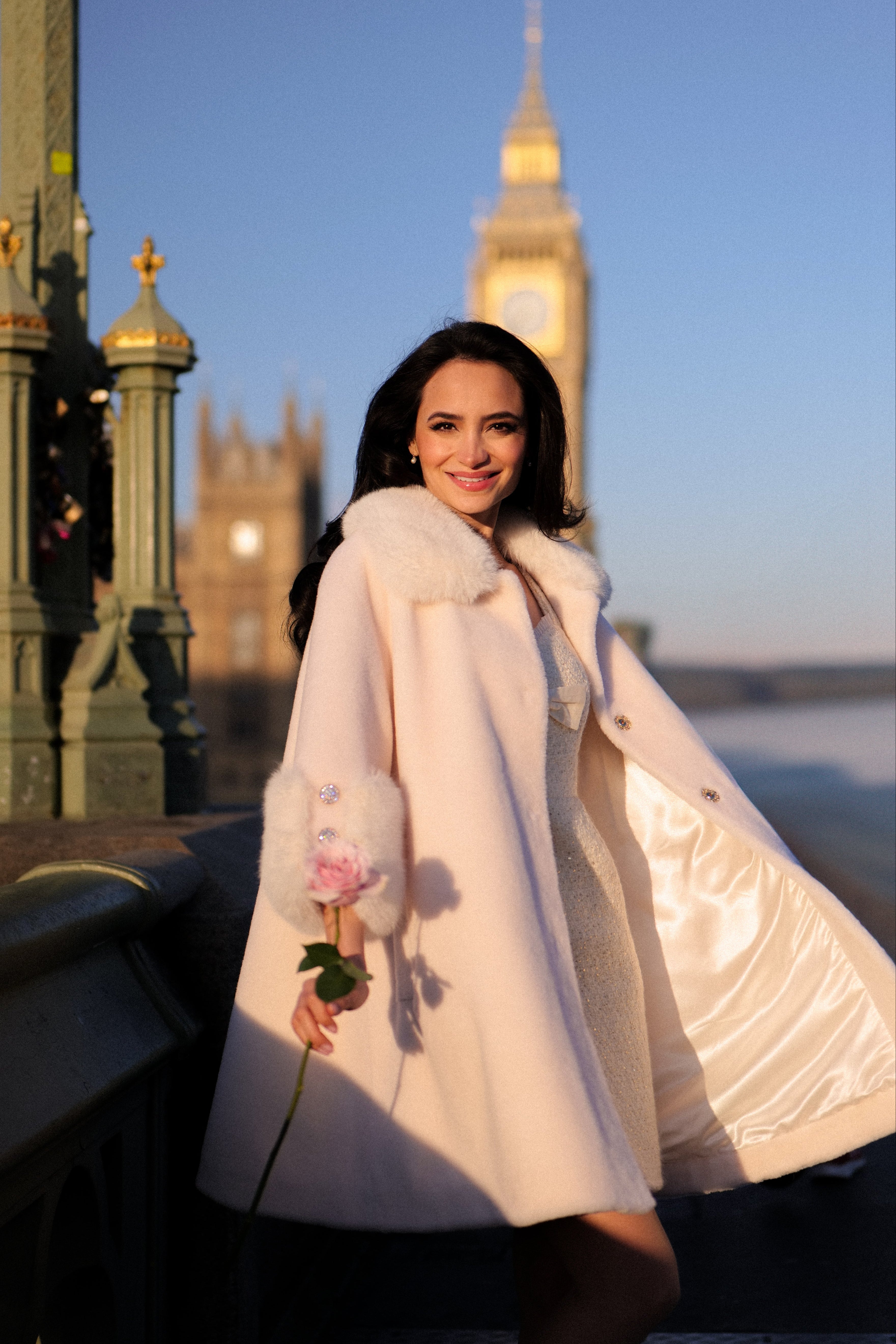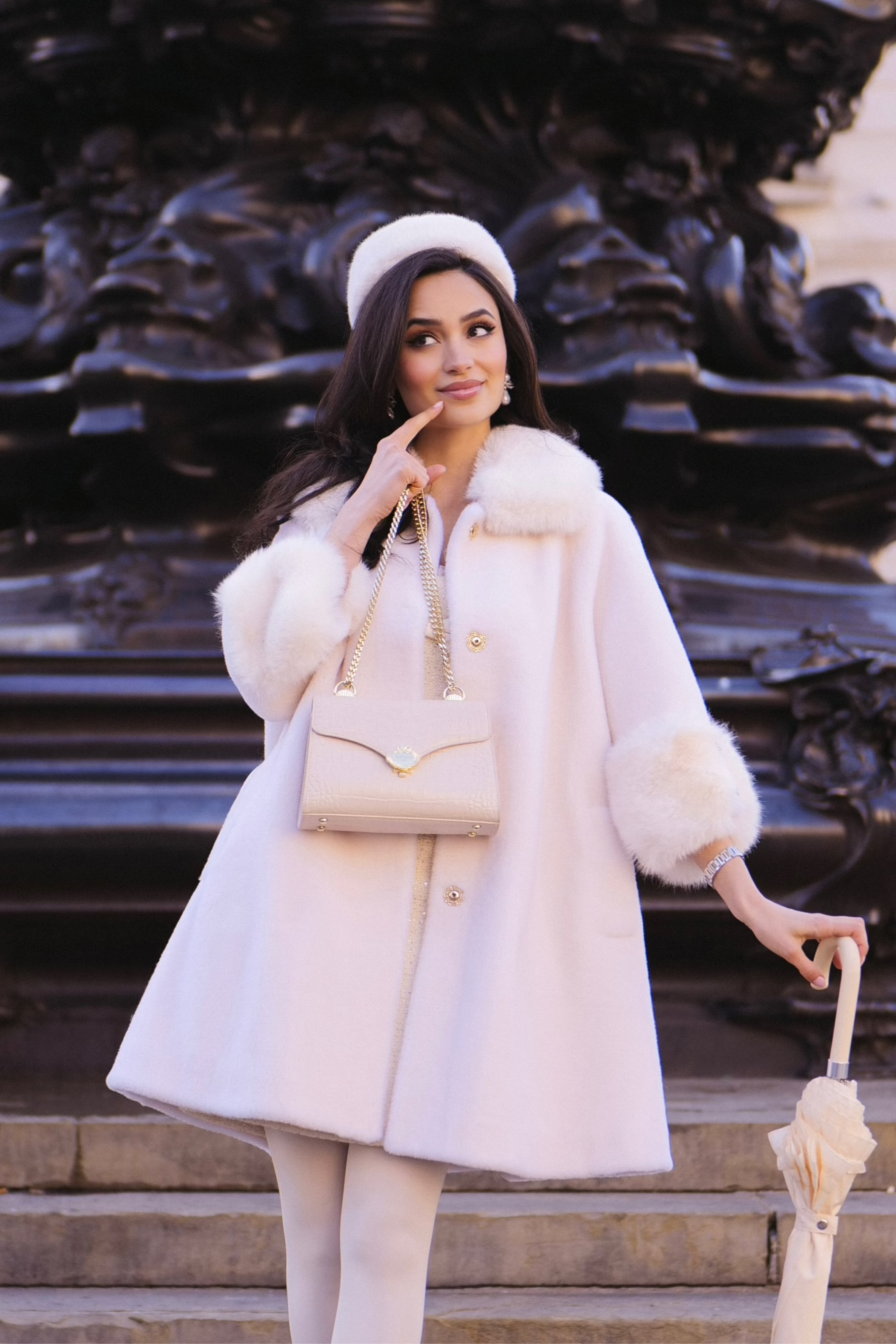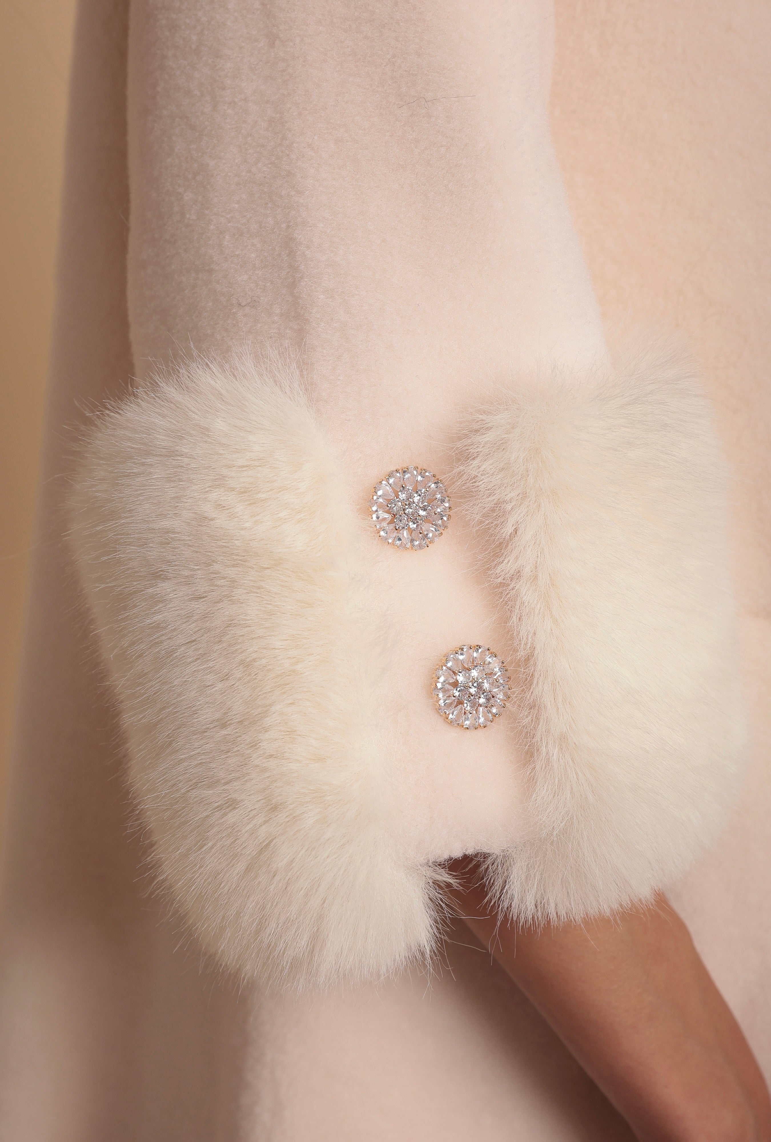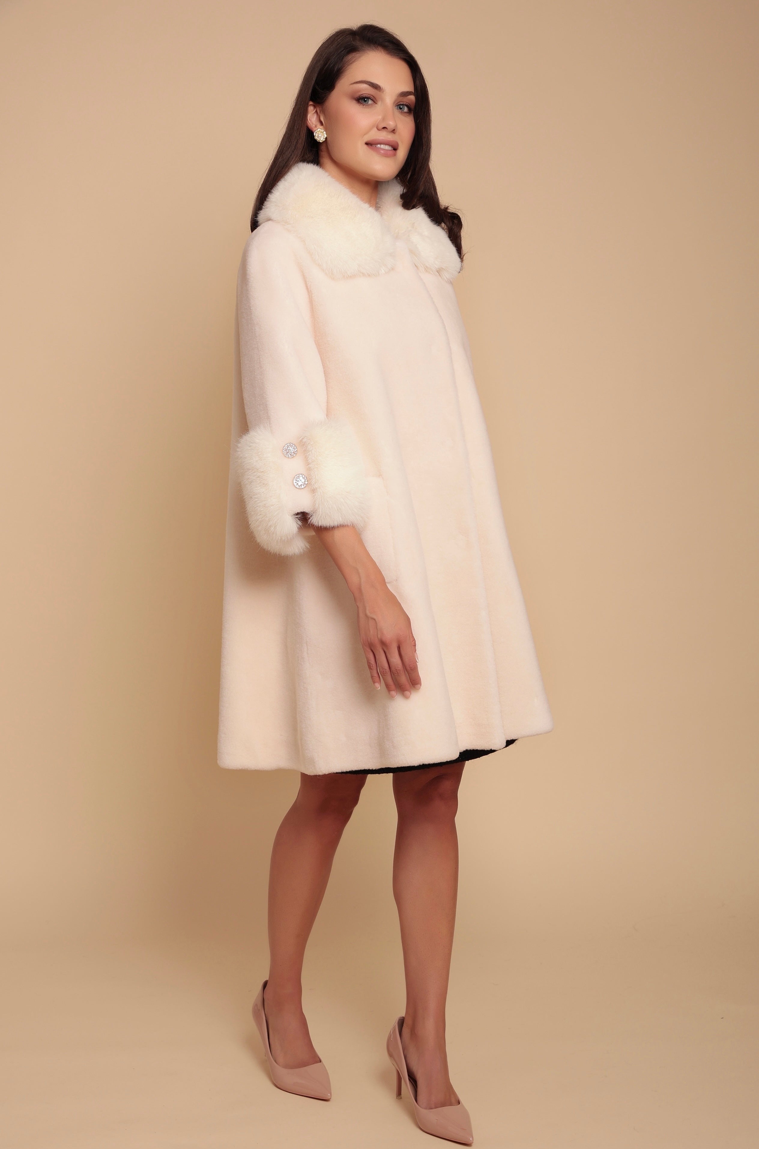 A timeless classic reimagined as our 'Marilyn' coat. Inspired by the incredibly sophisticated 'swing' coats of the '50s, this piece has an unmistakably classical silhouette. Crafted from 100% ethically sourced wool, trimmed at the collar and sleeves with the dream-like softness of the finest faux fur, and embellished at the sleeves by two zirconia crystal-embellished buttons, that sparkle like fine jewellery.