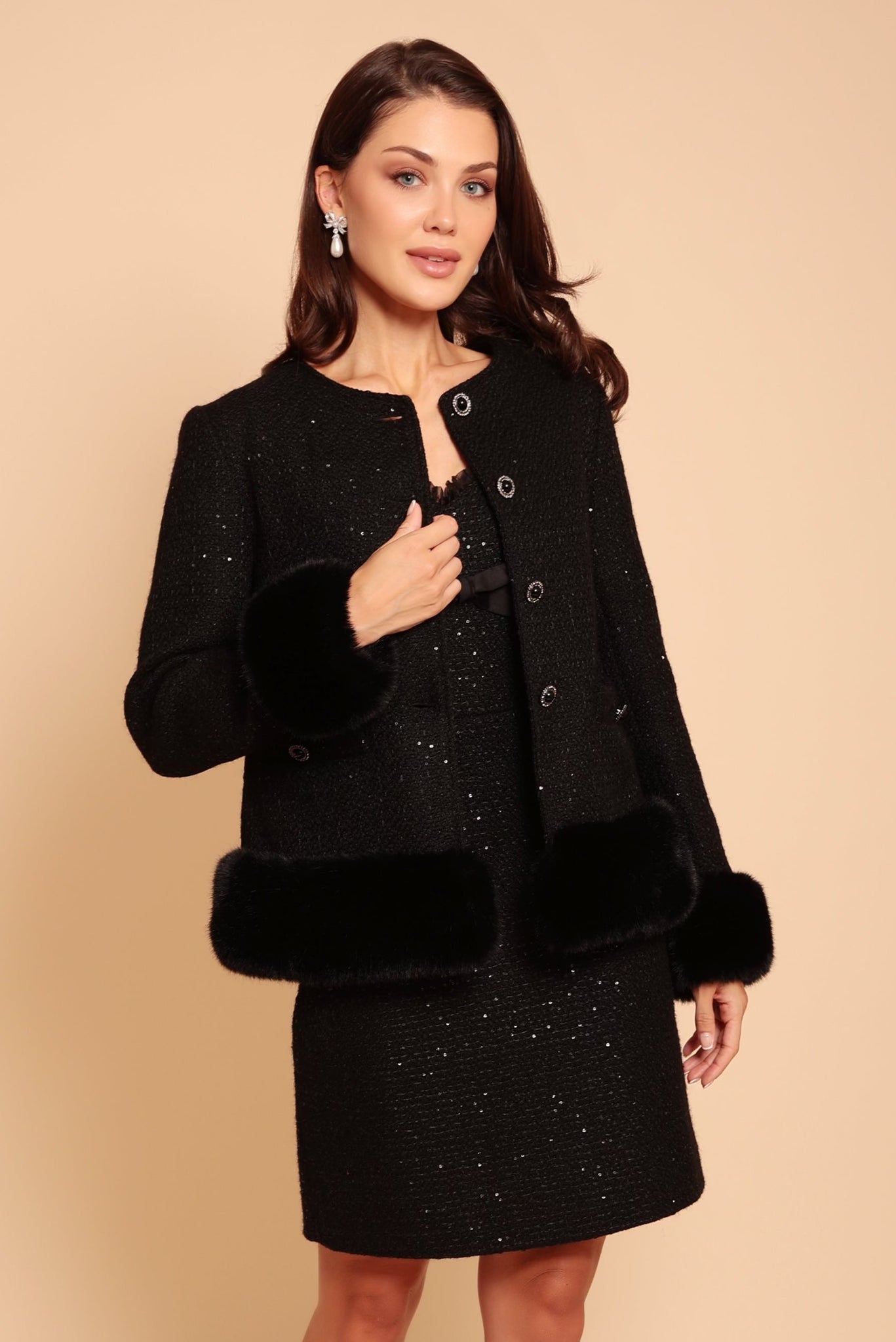 Wool Tweed Blazer Coat with Faux Fur in Nero