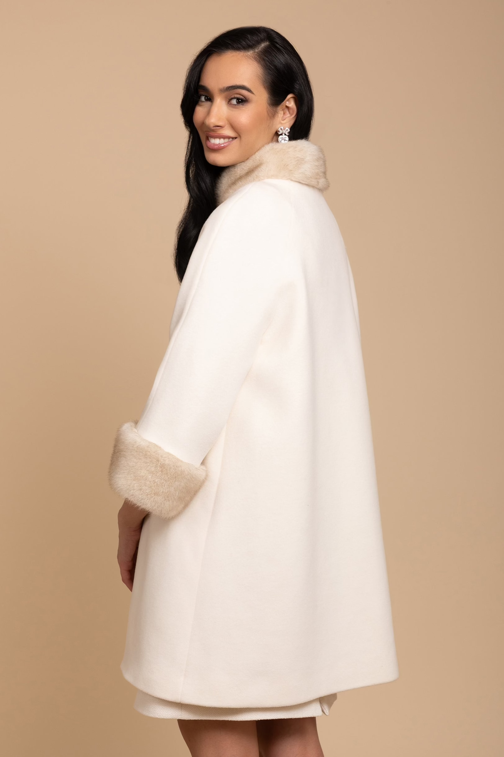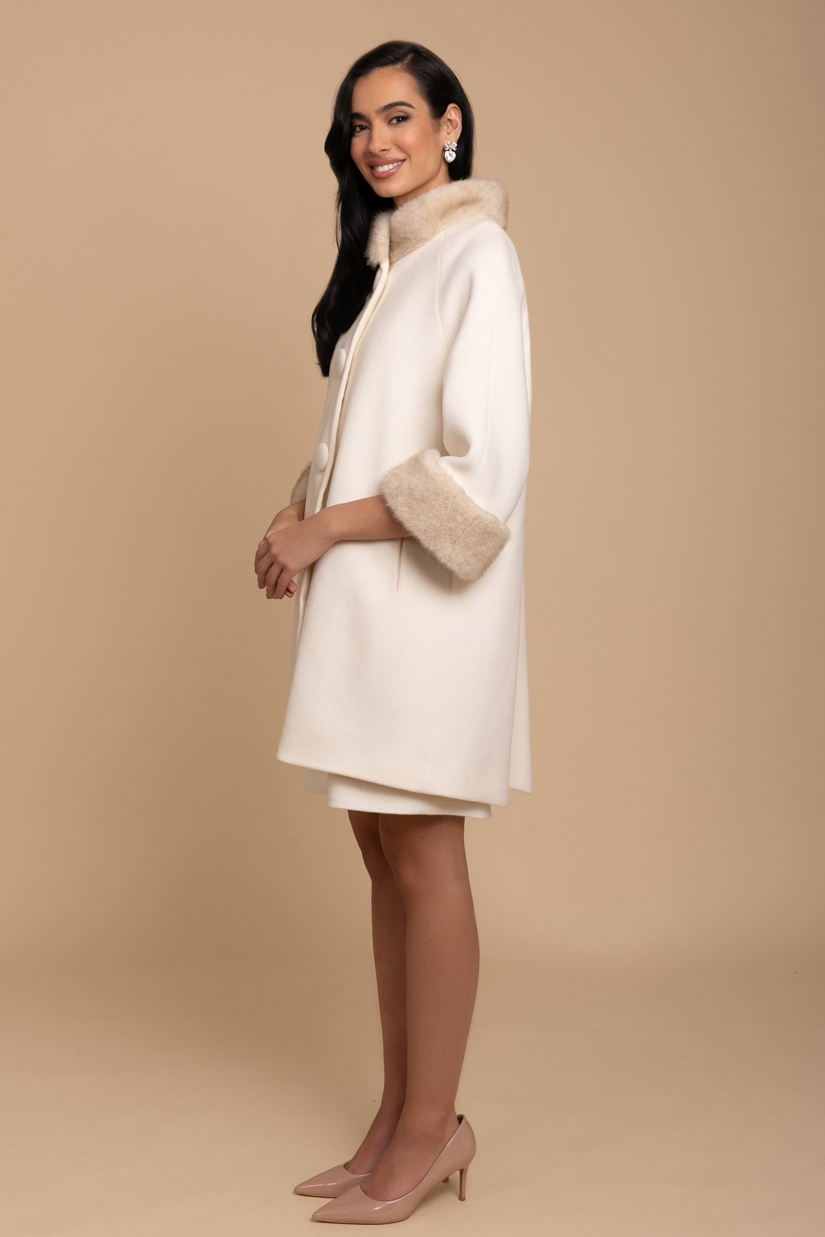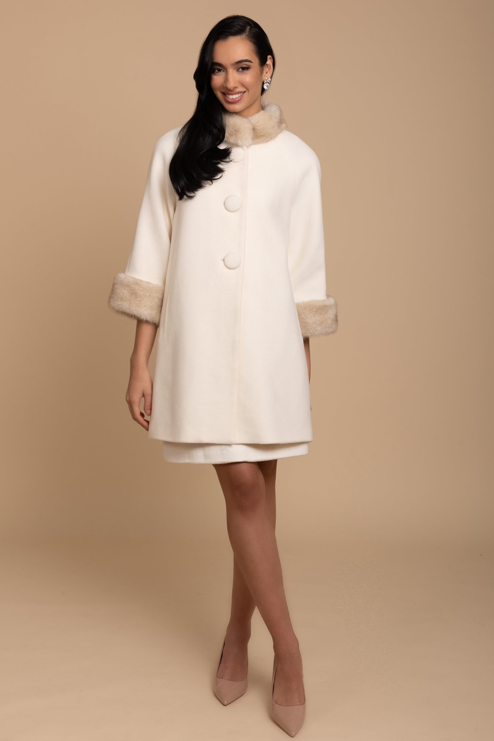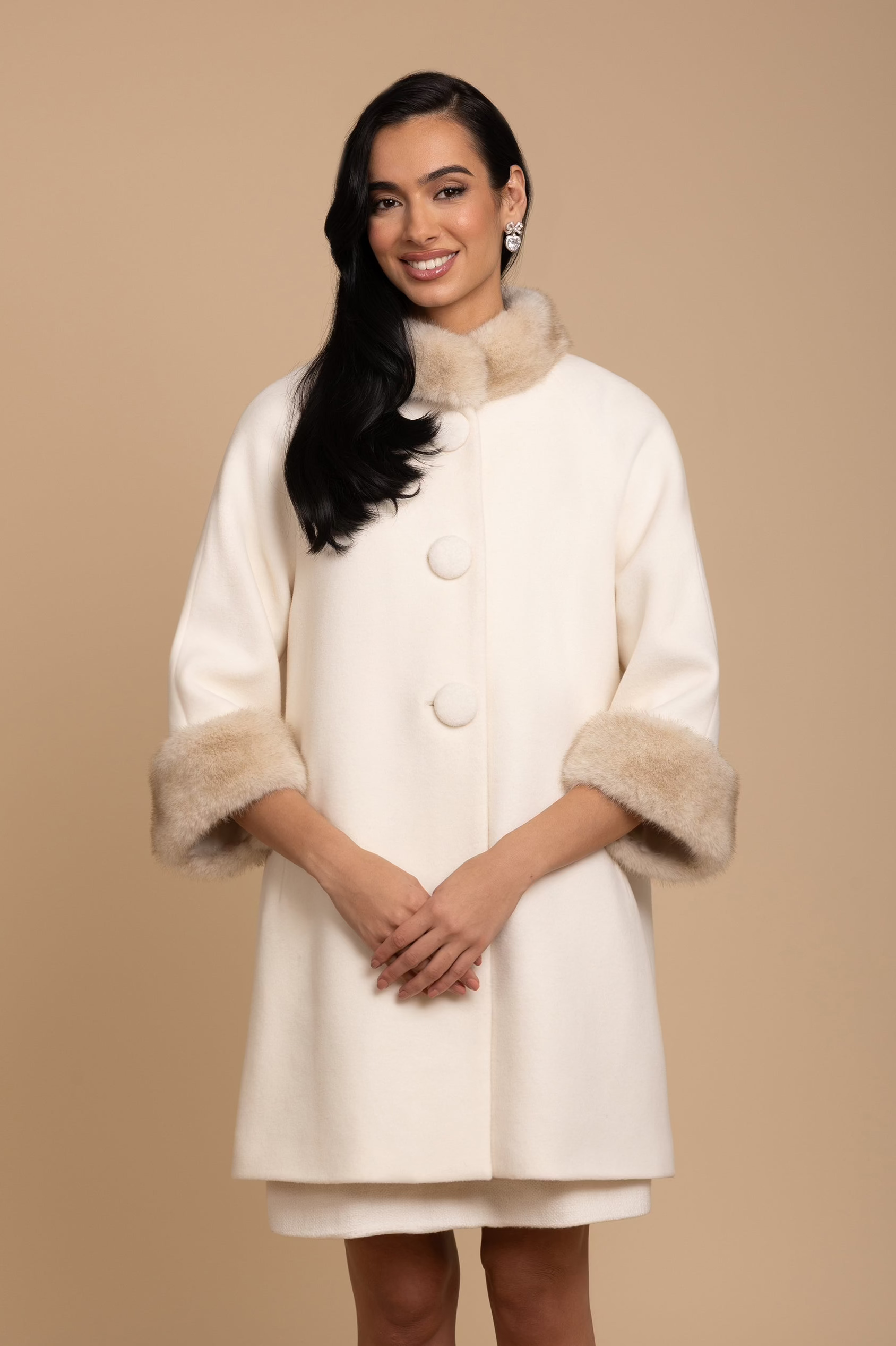 Introducing our 'Demure' – a timeless embodiment of refined luxury. Crafted from an opulent 90% virgin wool and 10% cashmere Italian fabric, the sophisticated A-line silhouette is accentuated by a luxurious faux mink trim adorning the collar and three-quarter length cuffs, lending an air of classic elegance. Three fabric-dressed buttons gracefully complete this classic creation.