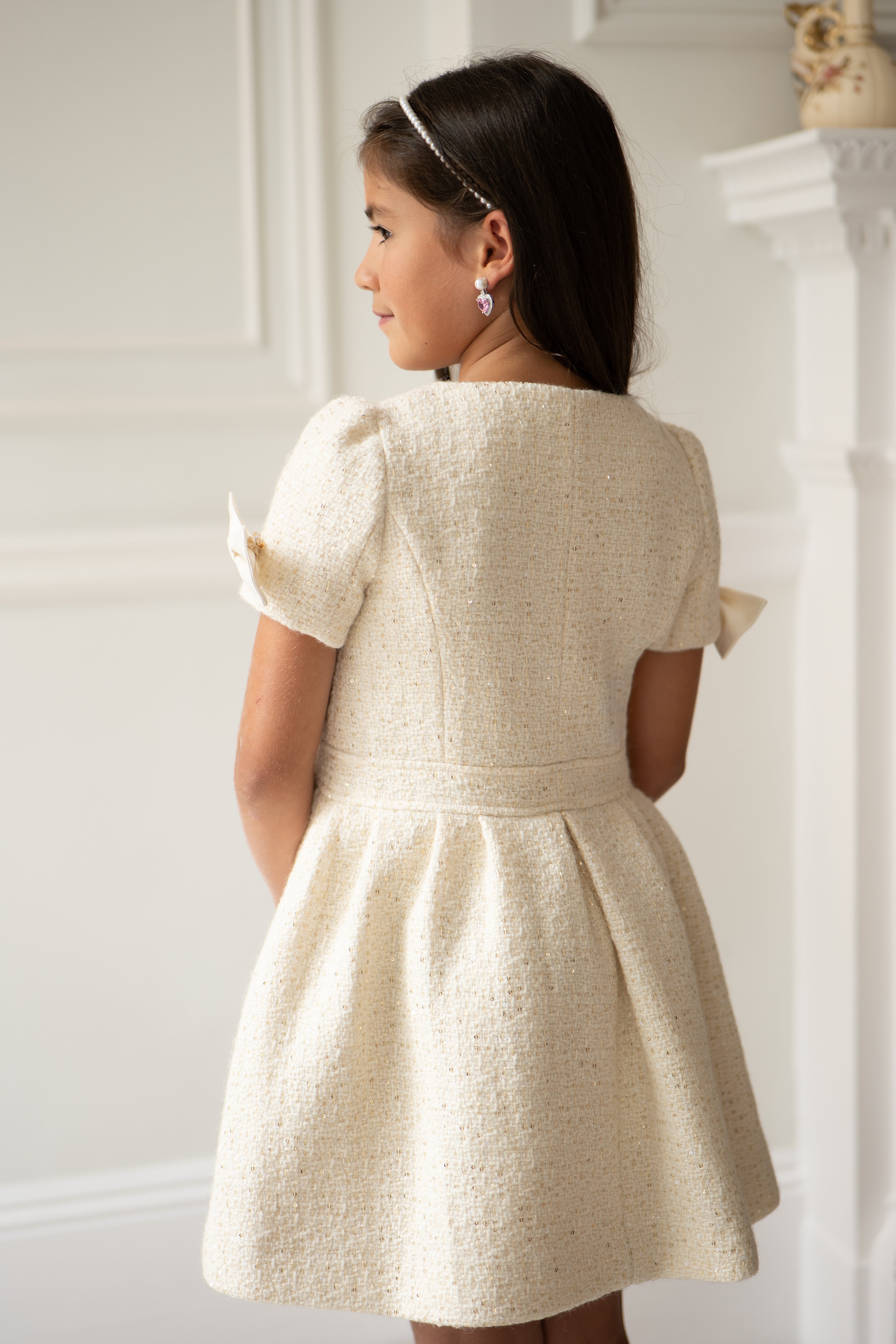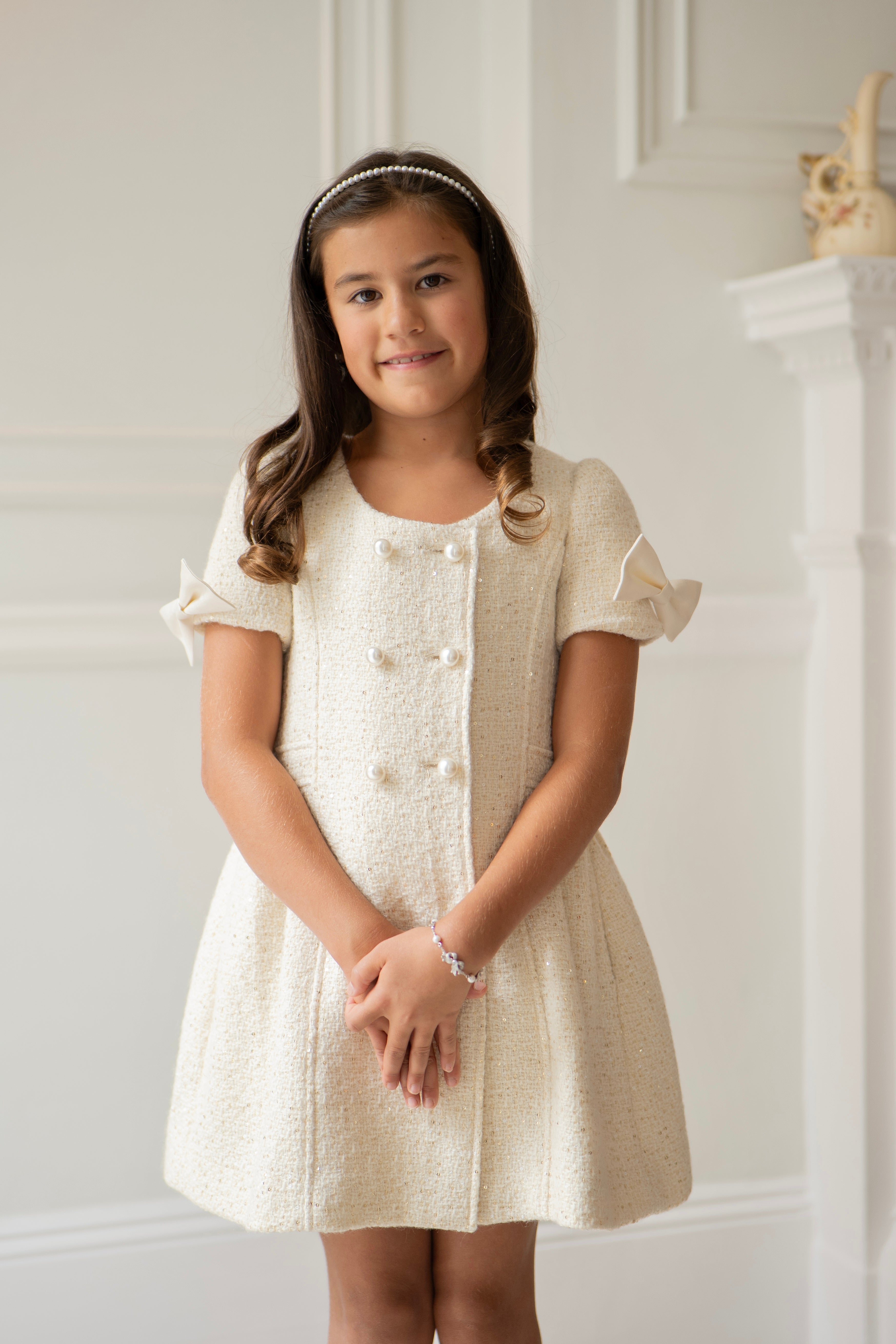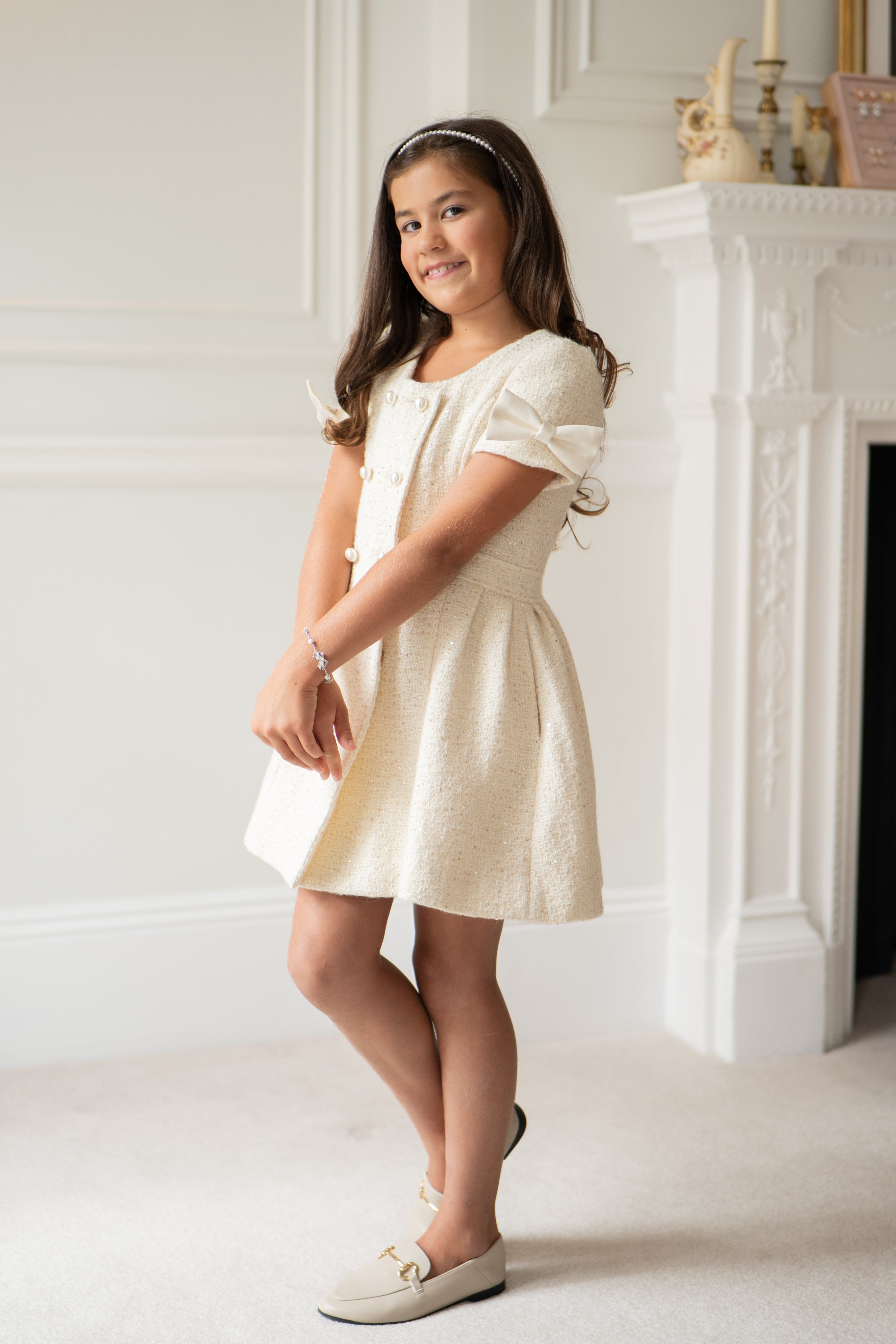 Sweet and playful. 'Golden Age' has a double-breasted design, fastened by our signature pearl buttons and immaculately tailored throughout. Crafted from our breathtaking woolen tweed fabric, embellished with small paetes, which create a mesmerising sparkle. Features detachable bows that can be moved around wherever you prefer!