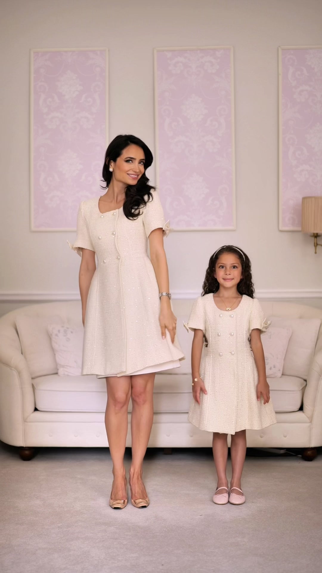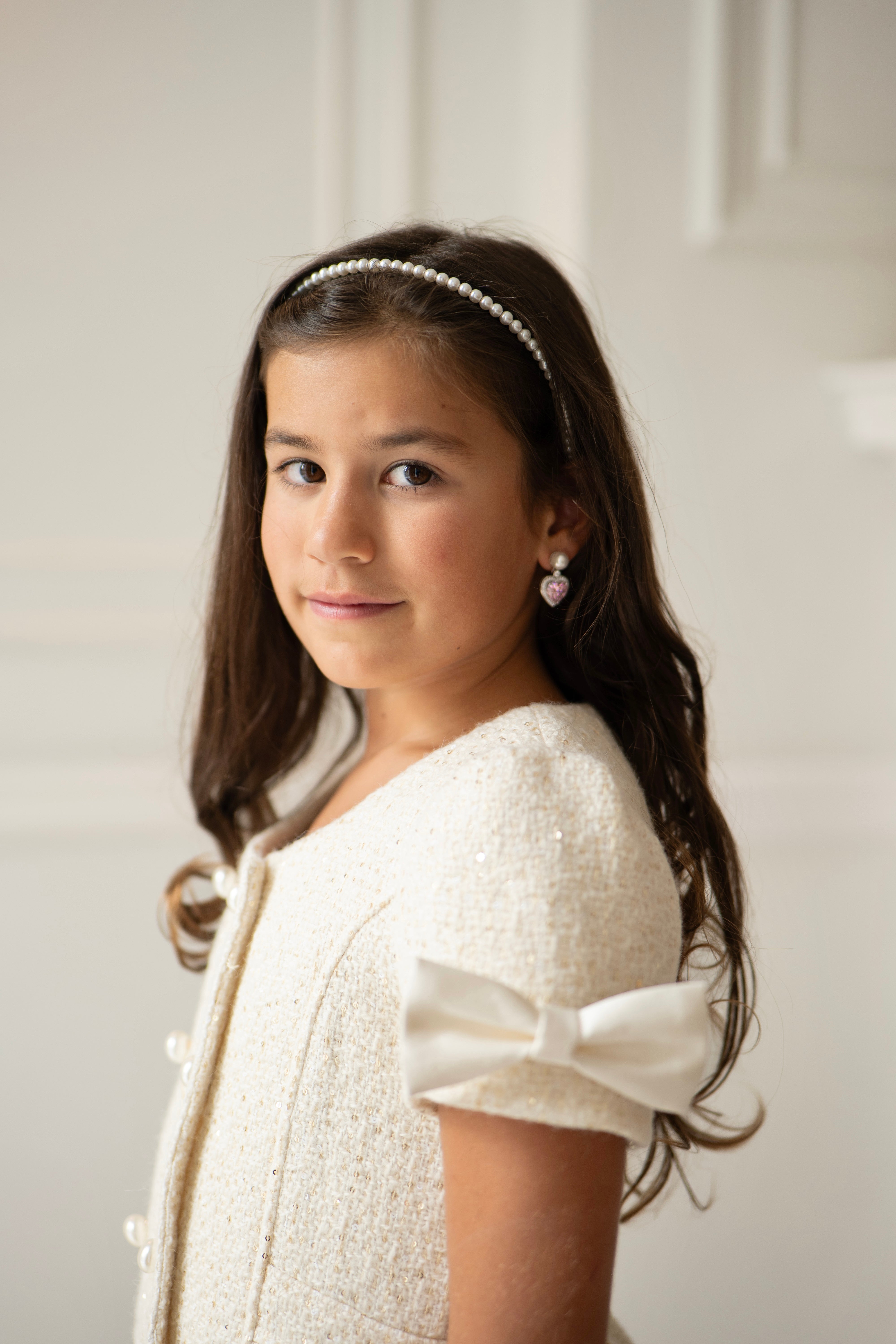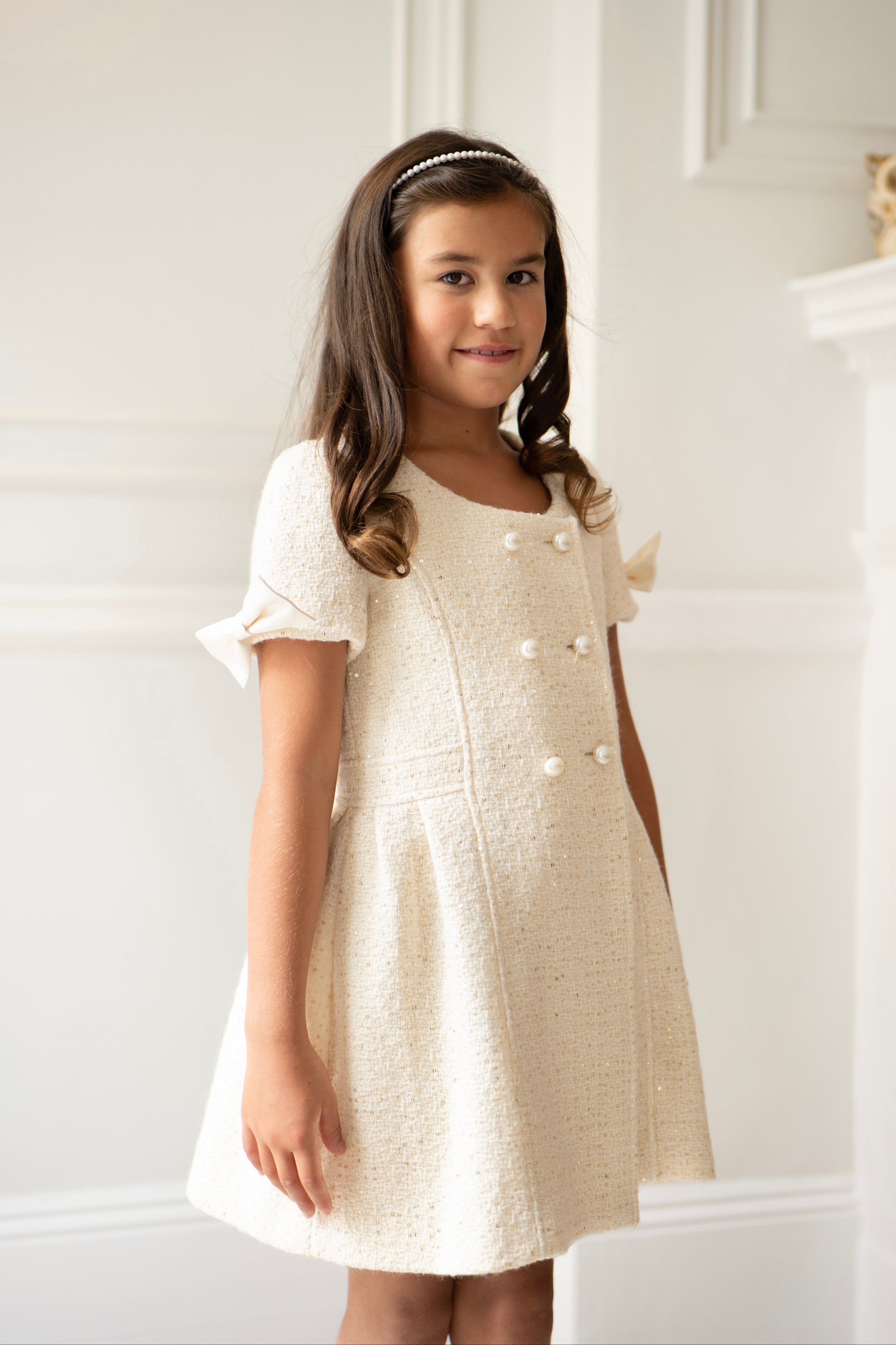 Sweet and playful. 'Golden Age' has a double-breasted design, fastened by our signature pearl buttons and immaculately tailored throughout. Crafted from our breathtaking woolen tweed fabric, embellished with small paetes, which create a mesmerising sparkle. Features detachable bows that can be moved around wherever you prefer!
