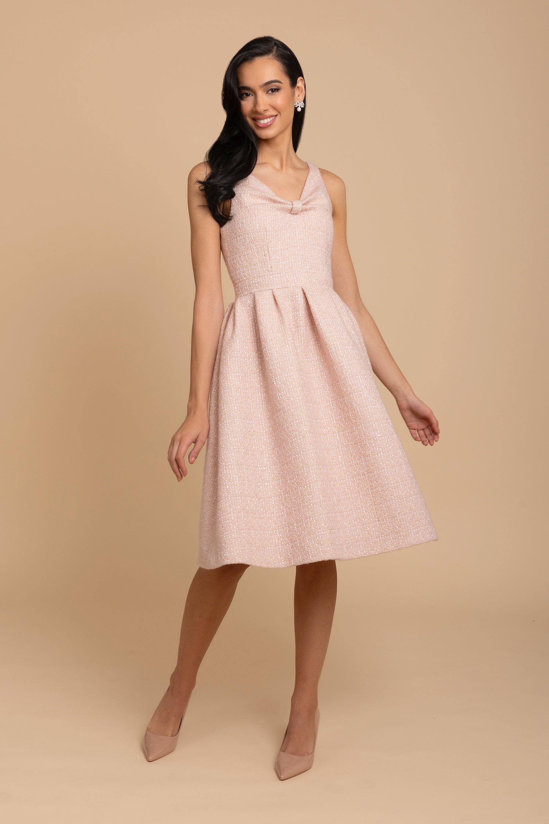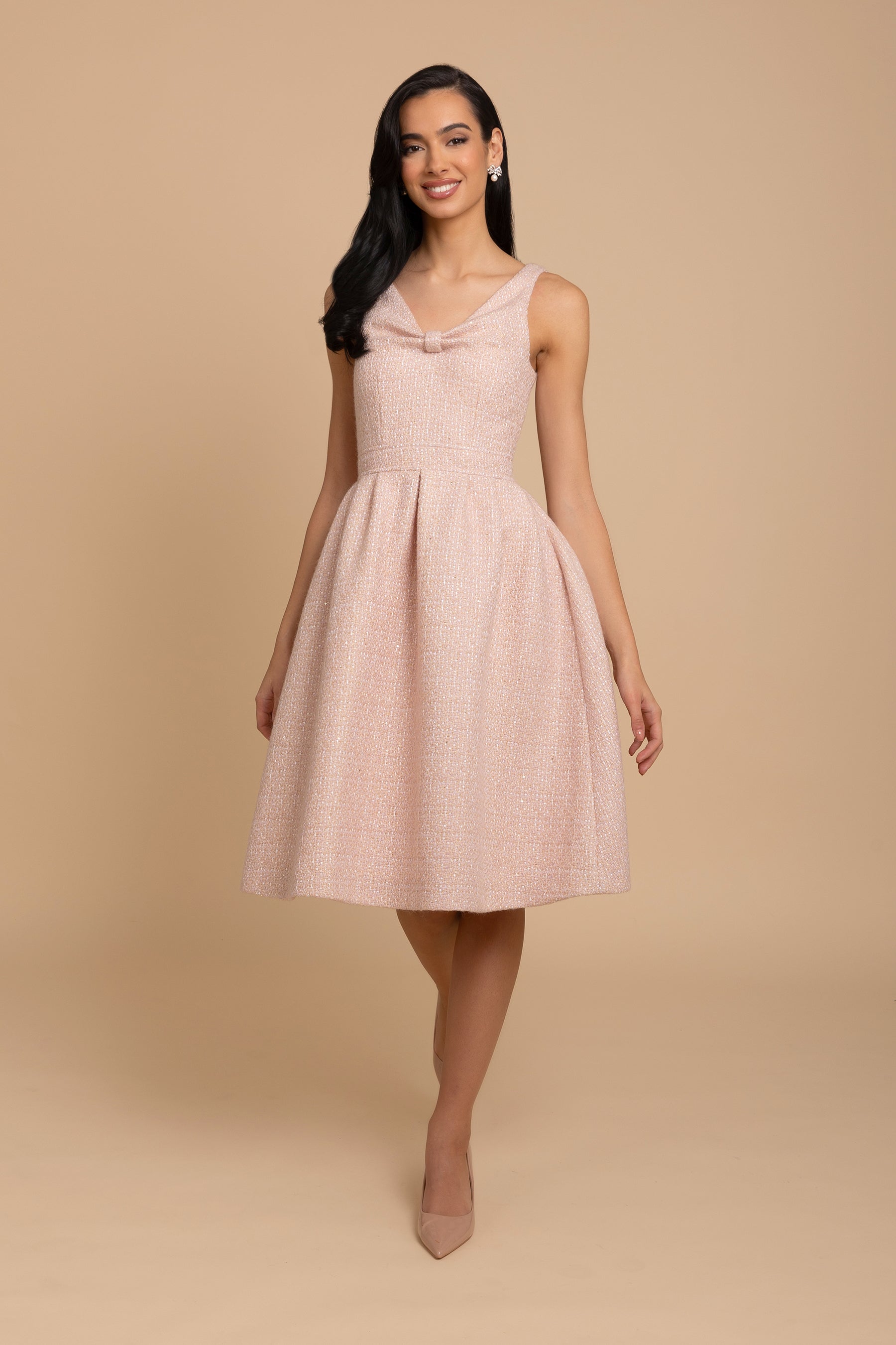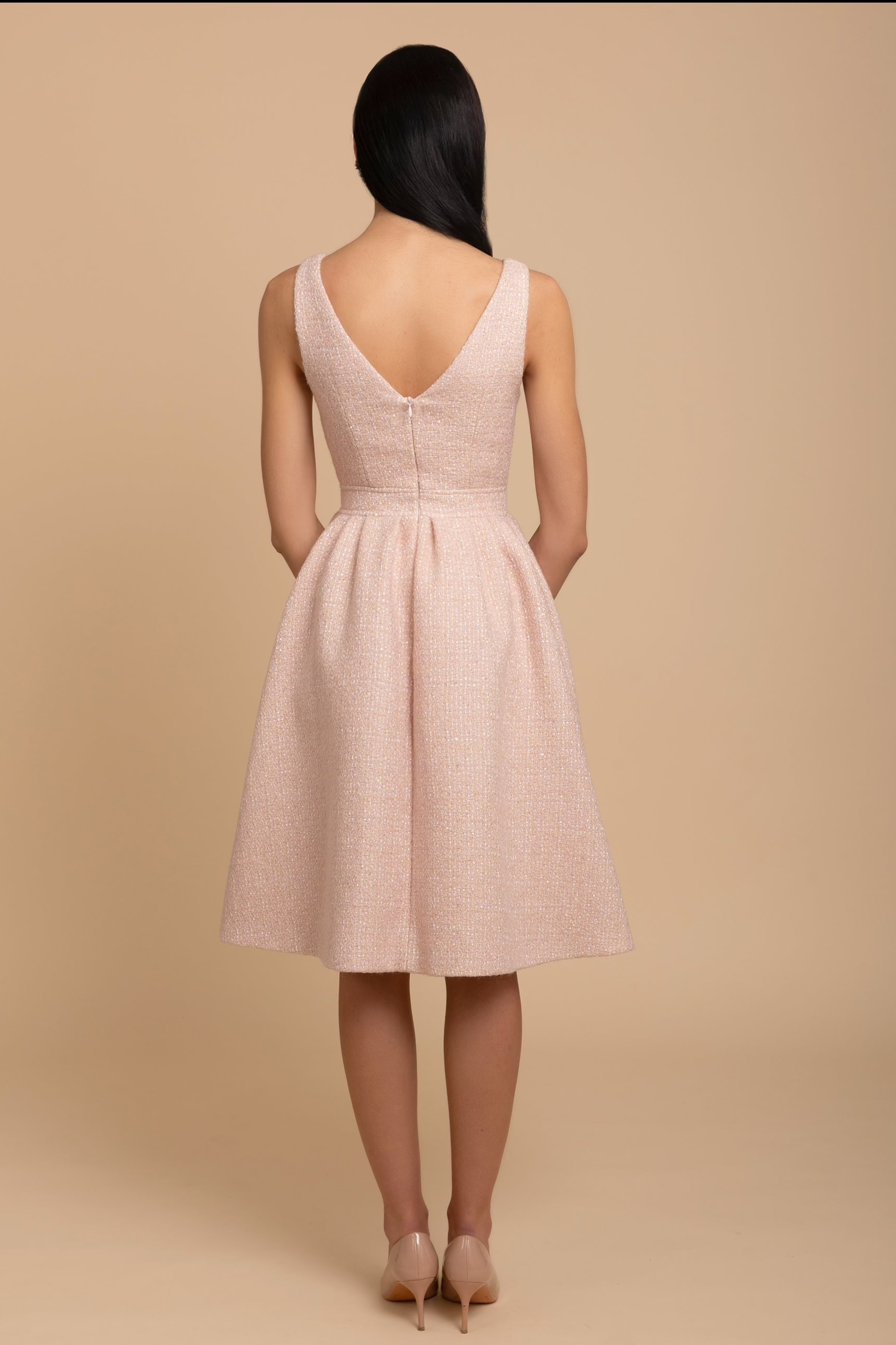 Undeniably sophisticated and classic. 'Splendour' features a hand-tailored bodice, designed to accentuate the waist, while its full pleated skirt gives it an undeniably regal and feminine appearance. The V-shaped neckline features an alluring design that frames the décolleté. Crafted from an exquisite woolen tweed fabric with a subtle shimmer, this dress is one truly elegant affair.