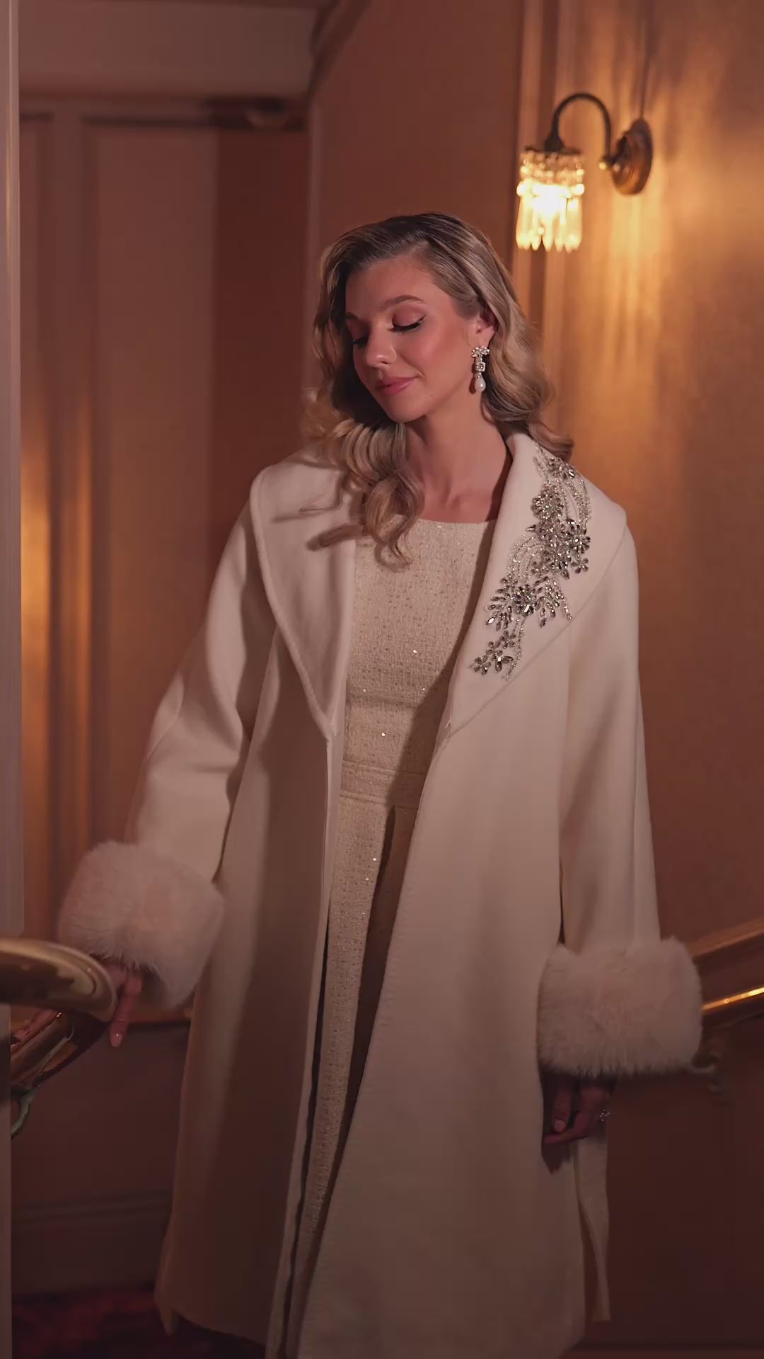 A vision of timeless elegance, the ‘Spotlight’ coat is crafted from an opulent Italian 90% wool and 10% cashmere fabric. Its luxuriously soft fabric drapes with effortless grace, cinched at the waist with a tailored belt to sculpt a feminine silhouette. Dream-like (detachable) faux fur cuffs whisper of old-world glamour, while the sweeping shawl collar is adorned with hand-applied crystal embroidery, shimmering like theatre lights against the night. A true starlet’s companion, this piece is as enchanting on the city streets as it is on the front row.