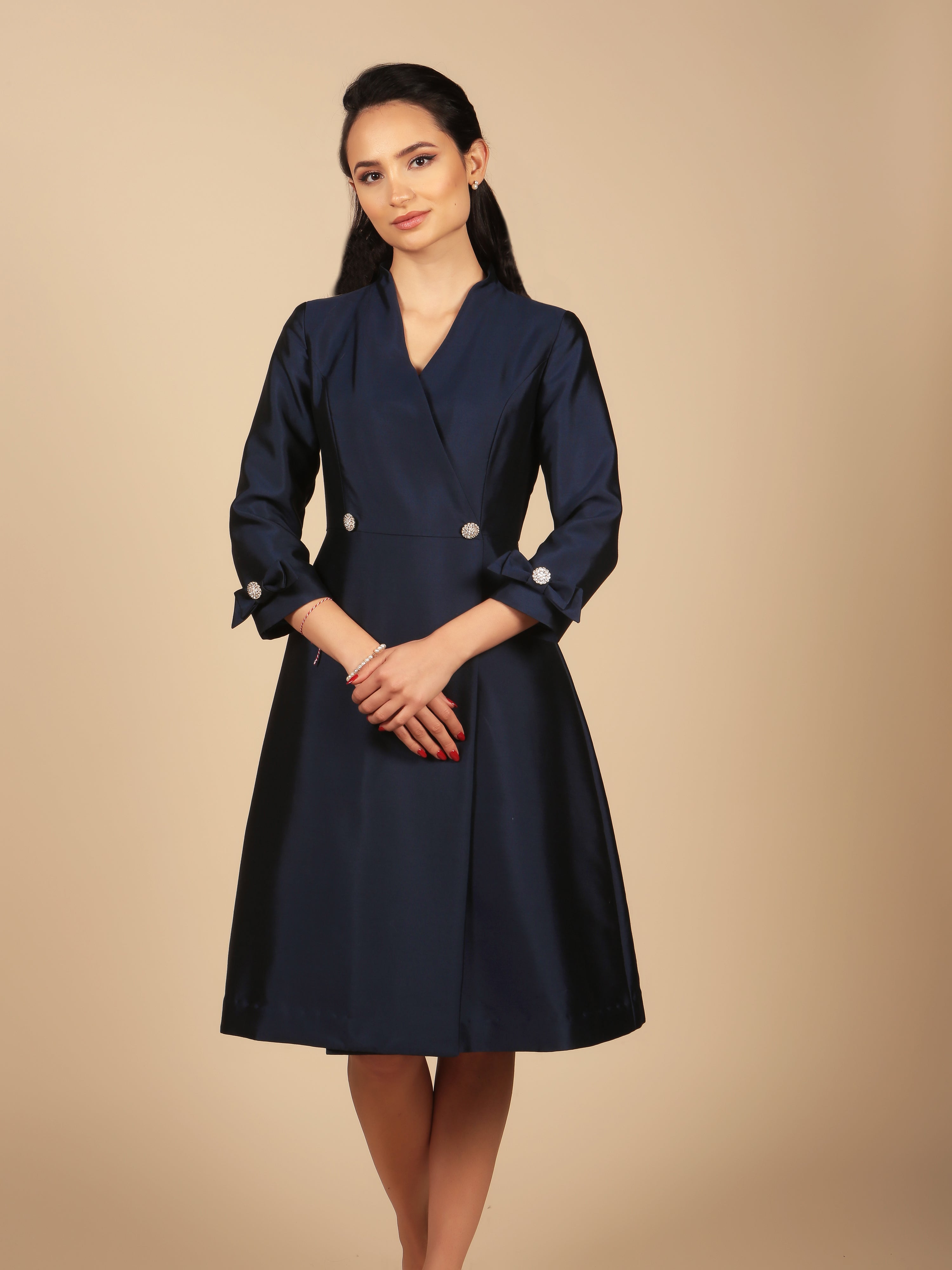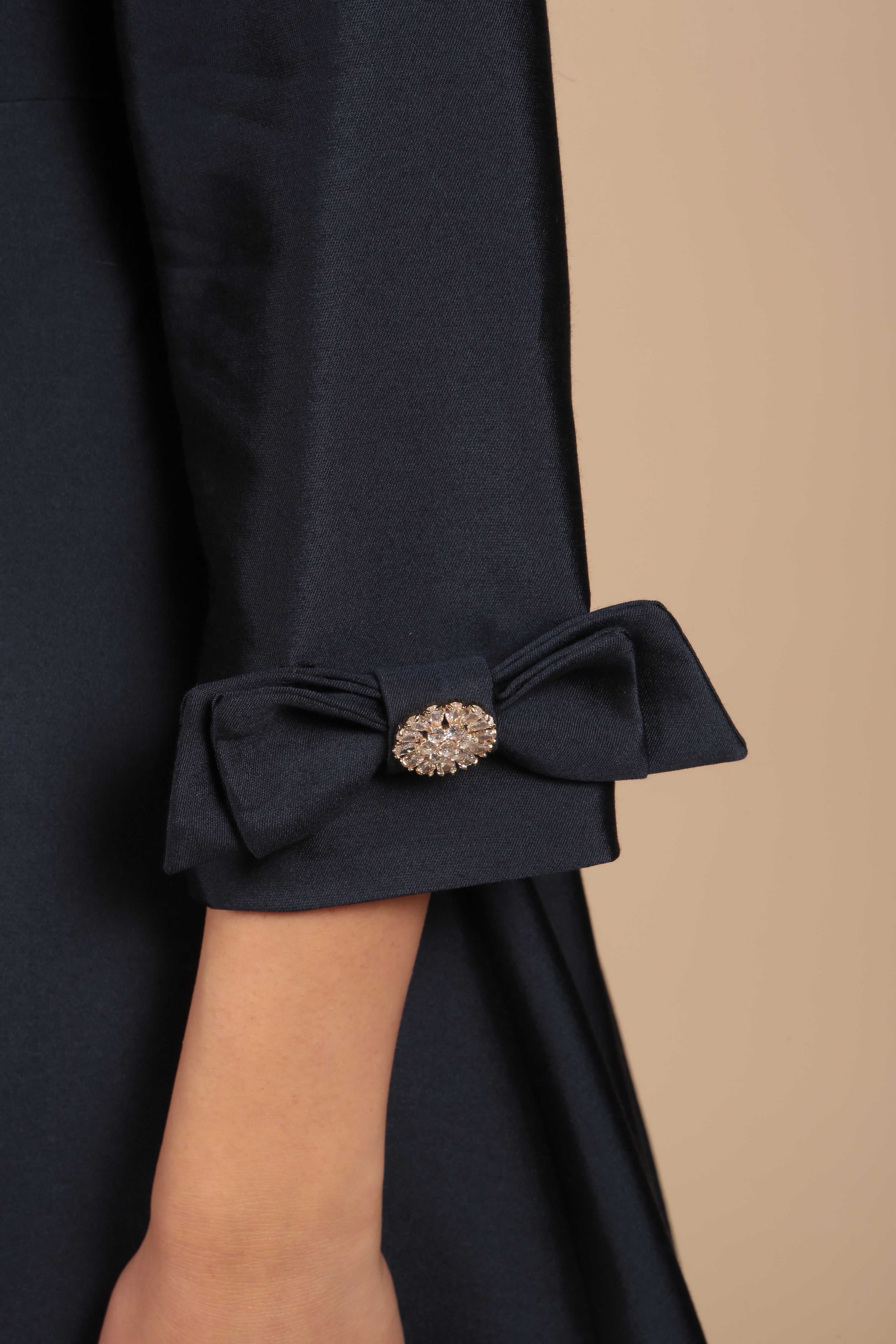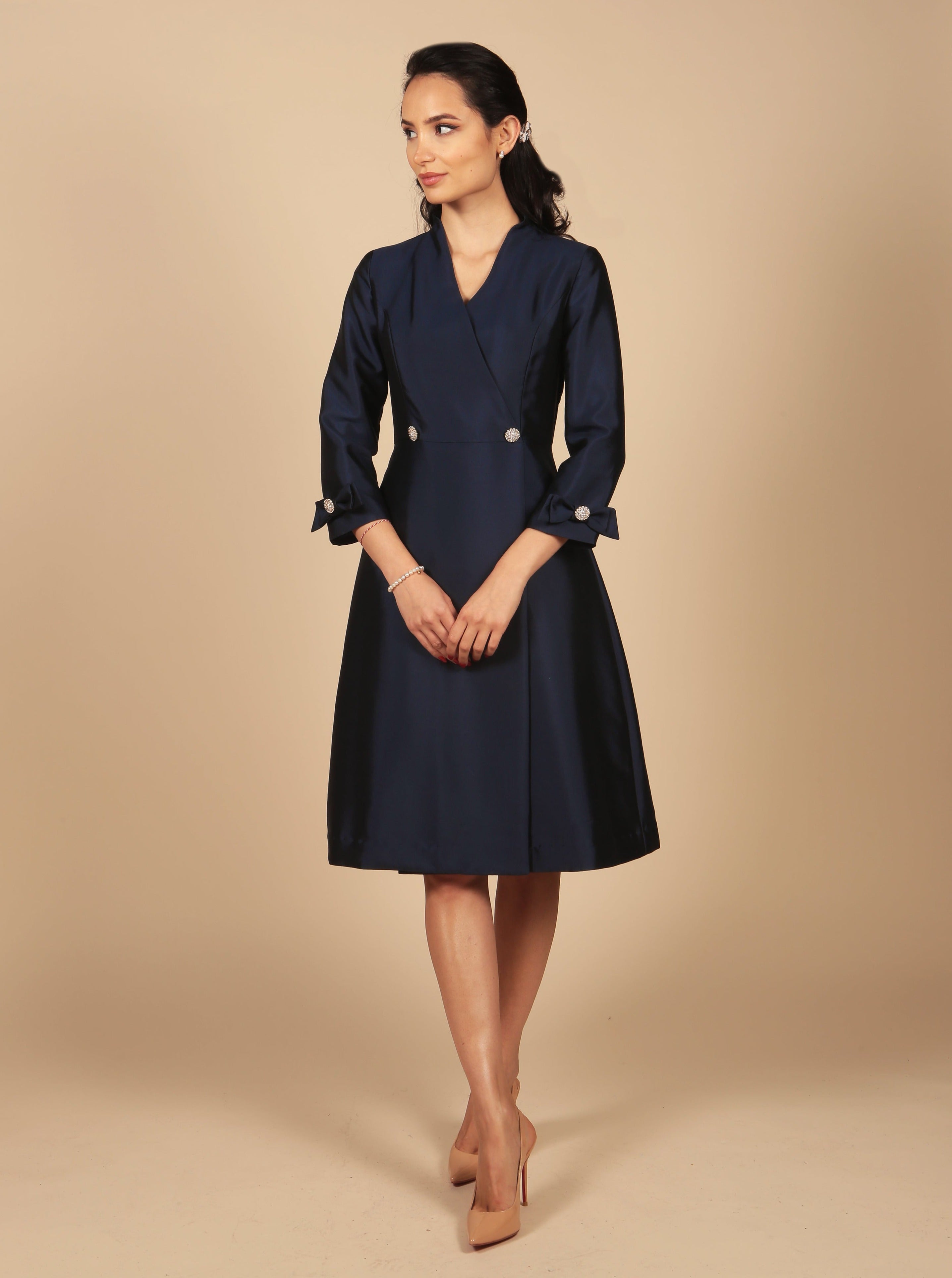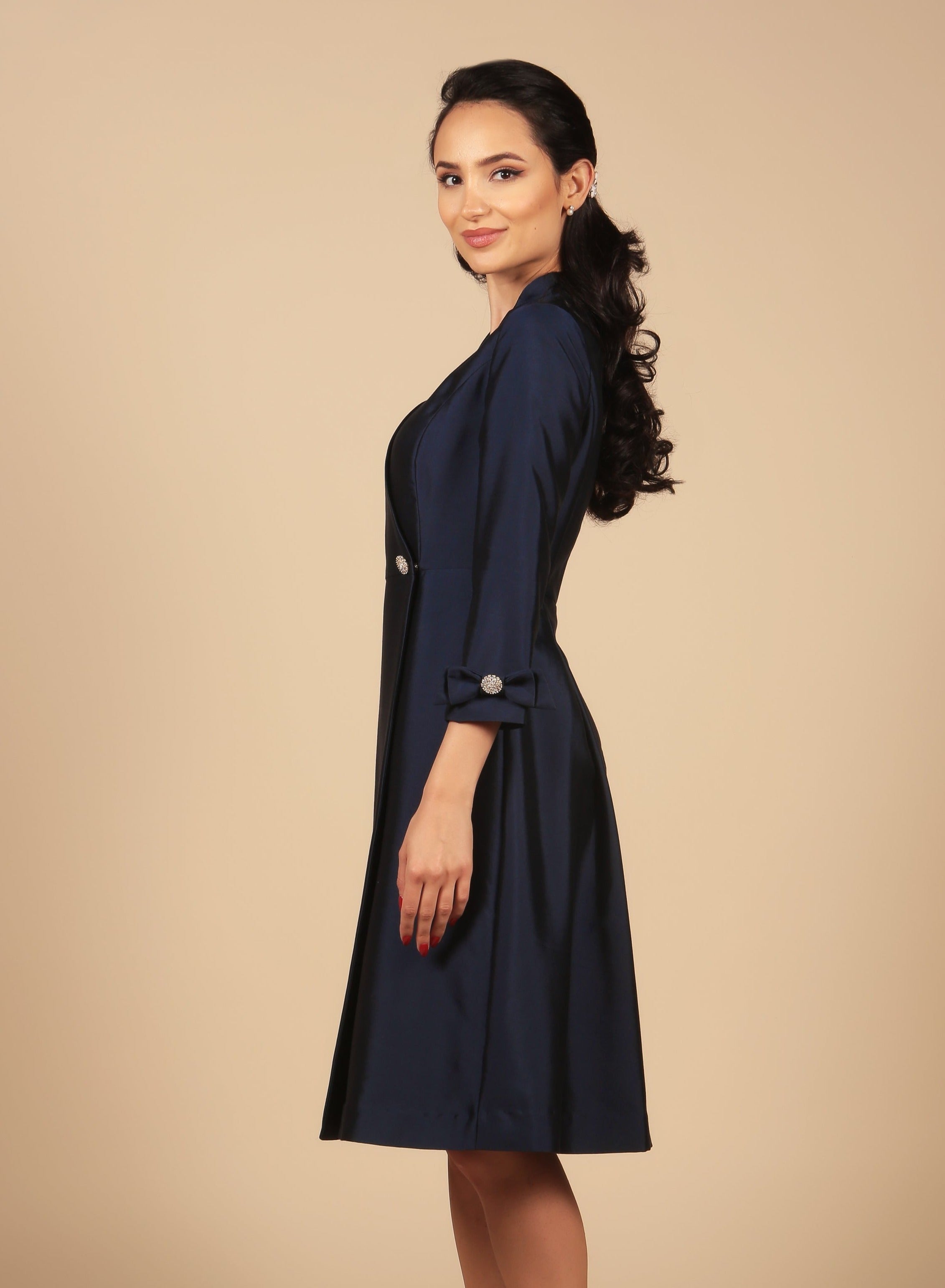 The epitome of sophistication. 'Astor' dress coat is crafted from the finest wool and silk fabric, which gives the meticulously tailored design a most opulent finish. Our signature zirconia crystal buttons add a joyous sparkle to the tailored bodice, and three-quarter length sleeves. Two delightful bows on each sleeve add a touch of feminine charm to this graceful creation, whilst the two pleats at the back of the skirt give it volume and structure.