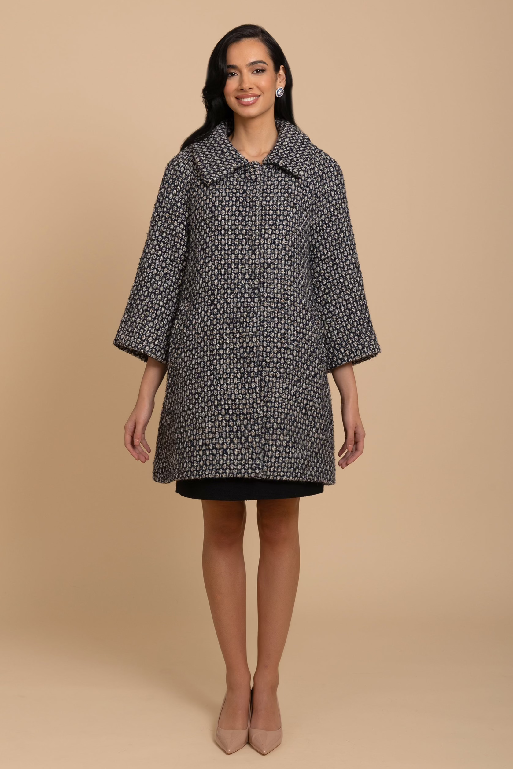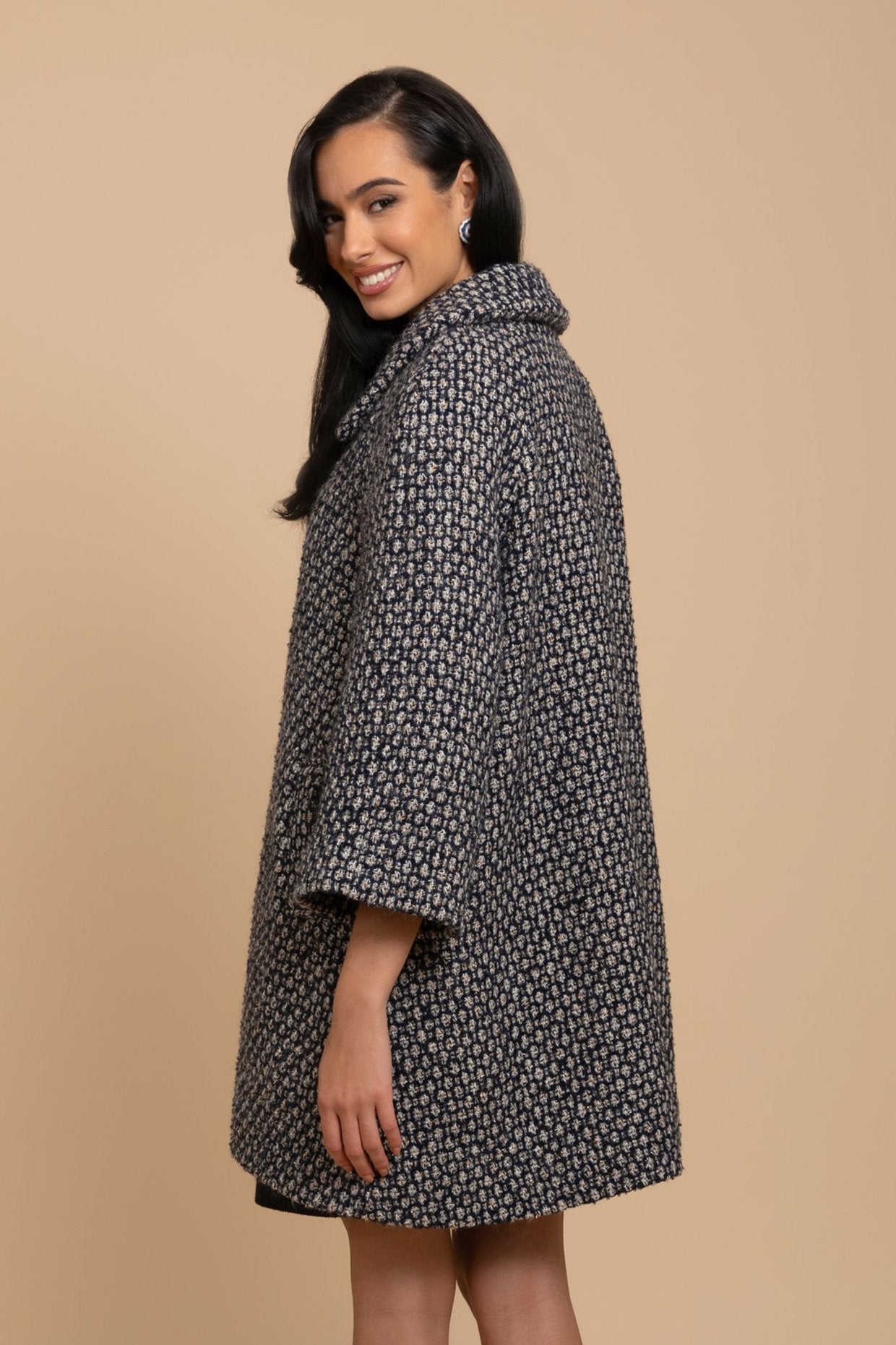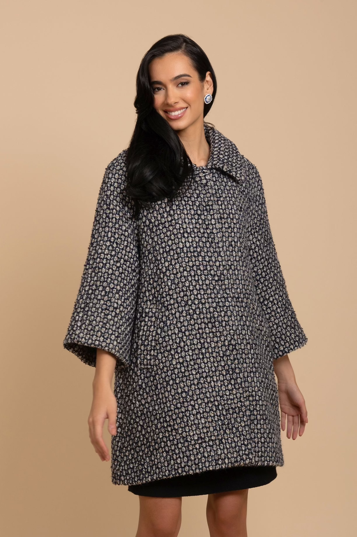 A timeless classic reimagined as our 'Twiggy' coat. Inspired by the playful, yet sophisticated 'swing' coats of the '60s, this piece has an unmistakably classical silhouette. Crafted from a striking woolen tweed embellished by golden threads, 'Twiggy' features three-quarter length raglan sleeves and a delightful 'Peter Pan' style collar.