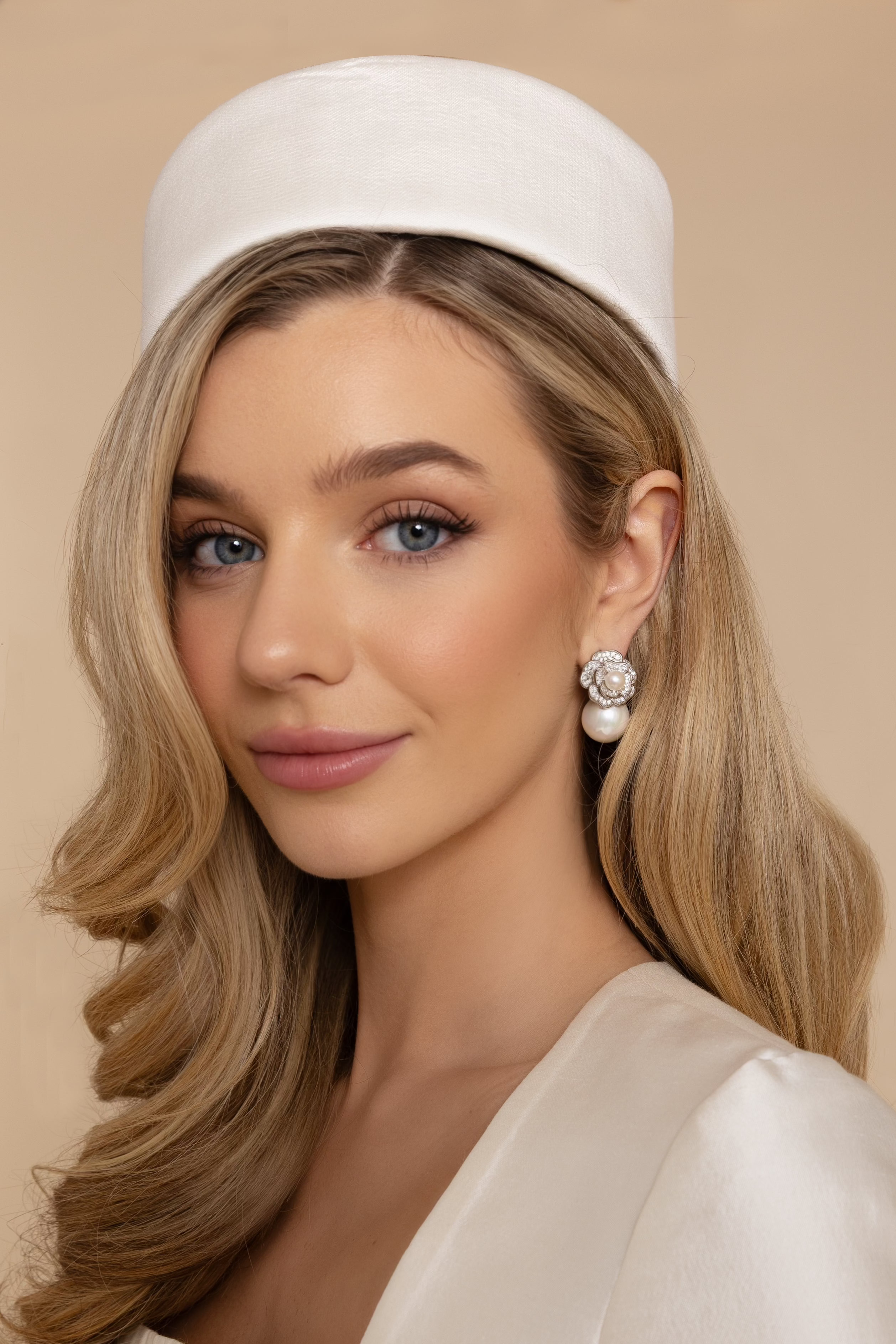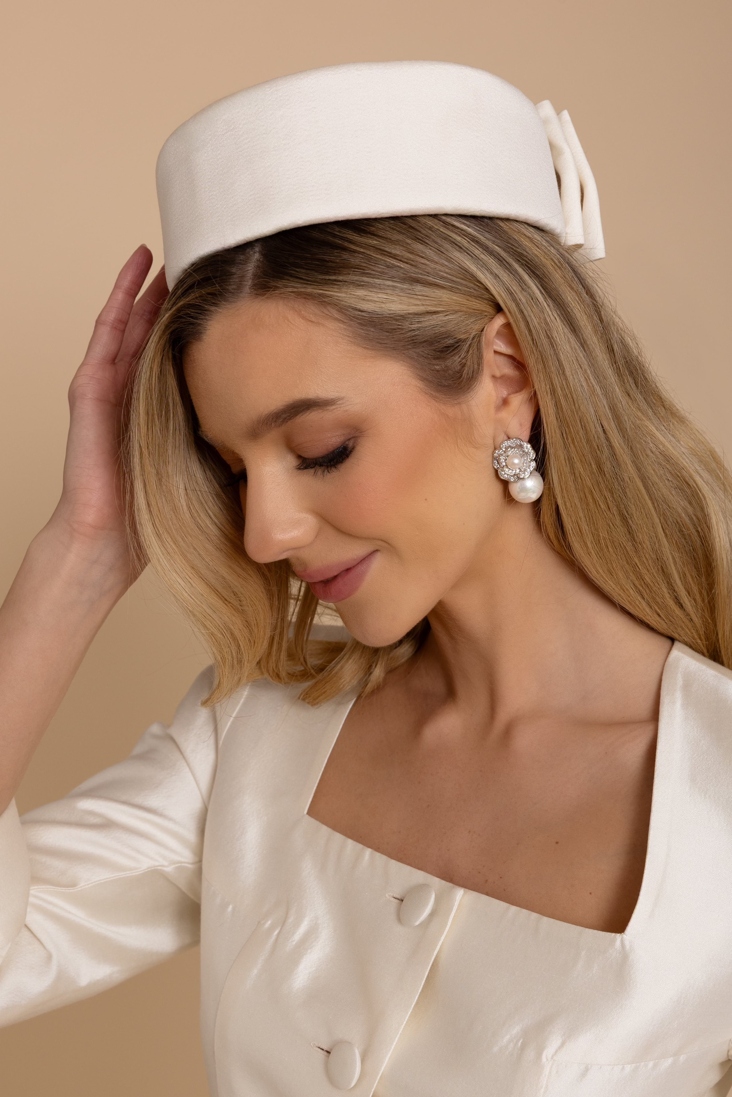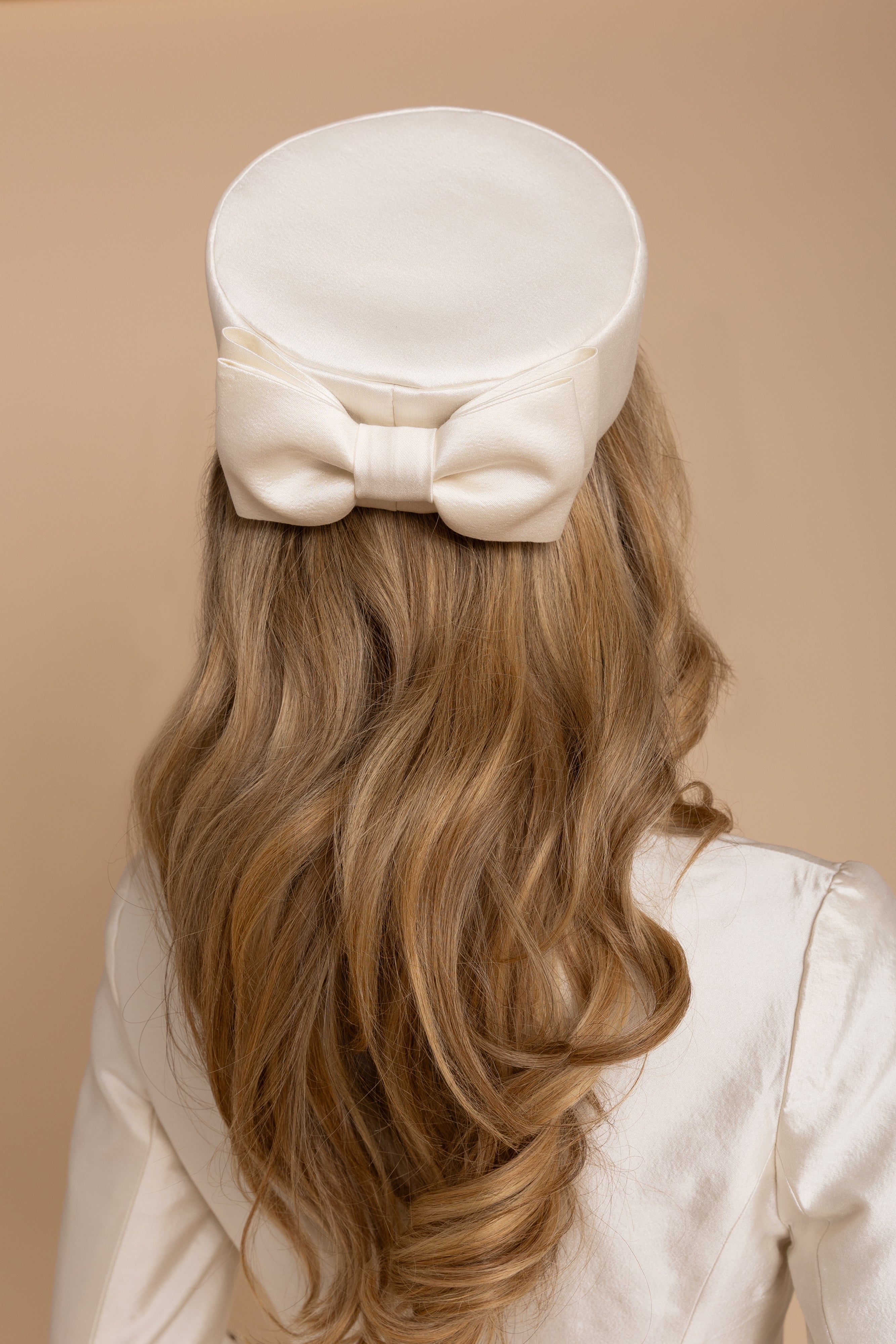 Silk and Wool Pillbox Hat with Bow in Bianco
